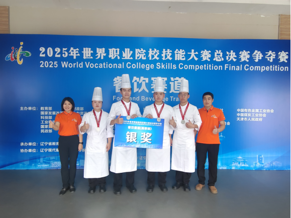 9月10日至11日,2025年世界职业院校技能大赛总决赛餐饮赛道争夺赛在辽宁现代服务职业技术学院隆重举行。本届大赛以“精湛技能、服务创新、文化融合”为核心理念,聚焦餐饮行业前沿技术与标准,旨在推动职业教育国际交流,提升我国餐饮人才的世界影响力。经过激烈角逐,天津海运职业学院代表队王文硕、李晓睿、孙瑞达、郭春雨四位同学凭借出色表现斩获银奖,充分展现了学院烹饪学子的专业素养与创新风采。