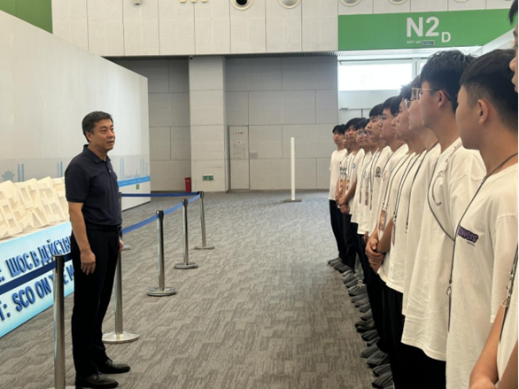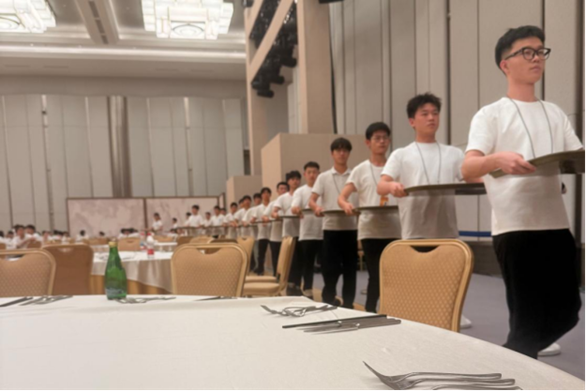 7月7日,全体志愿者怀揣着使命与期待,从学校整装出发,前往天津梅江会展中心及相关驻地,开始了为期56天的封闭式集中培训与准备工作。在此期间,志愿者们接受了系统性的高强度集训,内容涵盖外事礼仪、国际交往惯例、宴会服务流程、应急情况处置及必要的语言强化训练等。为确保志愿服务保障工作无缝衔接,学院还精心选派了9名骨干教师作为带队老师,分组值班,全程负责志愿者的组织管理,与学生们同吃同住。