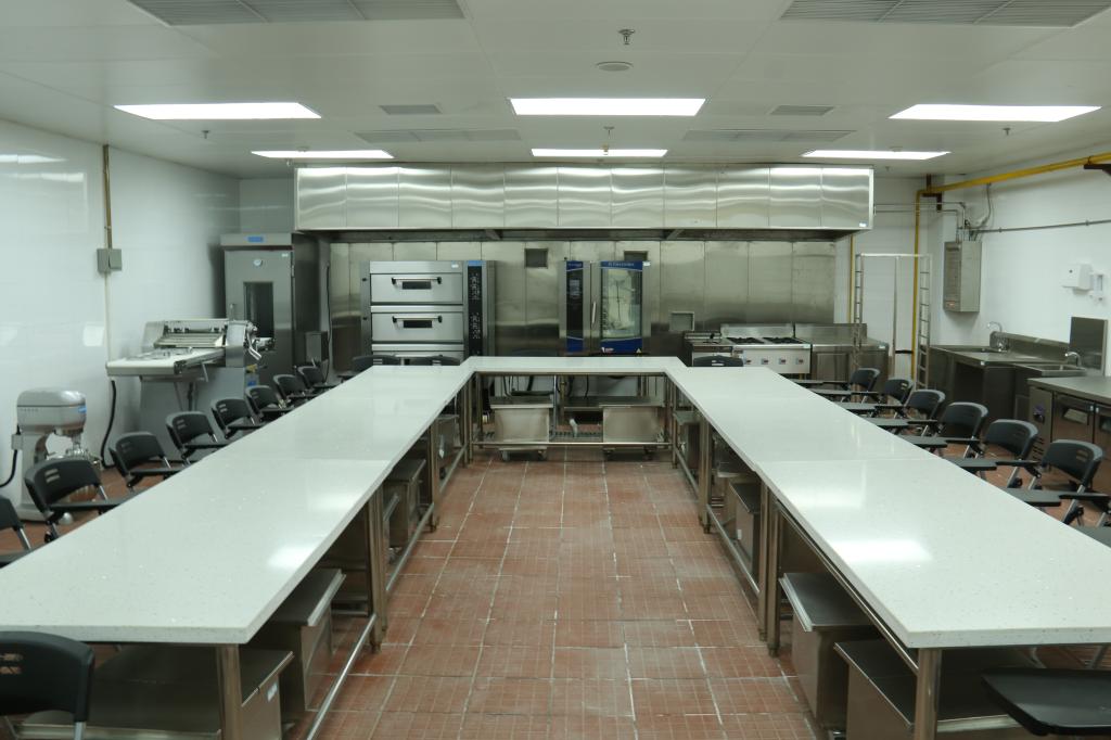 西餐烹饪实训室拥有先进的实训操作、教学演示设施设备,是集演示和实训于一体,按照教师授课、学生实训与星级饭店厨房相互融合建设的多功能操作及示范教室规模近268平米,操作台、调料车、冰箱、制冰机、主要设备有7套西餐组合灶具,一台万能蒸烤箱,一台倾斜式汤锅,一台倾斜式煮菜锅,一台绞肉机,一台搅拌机,一台切片机先进的排烟和消防系统等总价值26万。本实训室同时可容纳20人进行,西餐烹饪的刀工、勺工、热菜烹调等课程的演示、学习和练习。西餐实训室不仅满足教学使用,还可以进行西餐厨艺比赛。